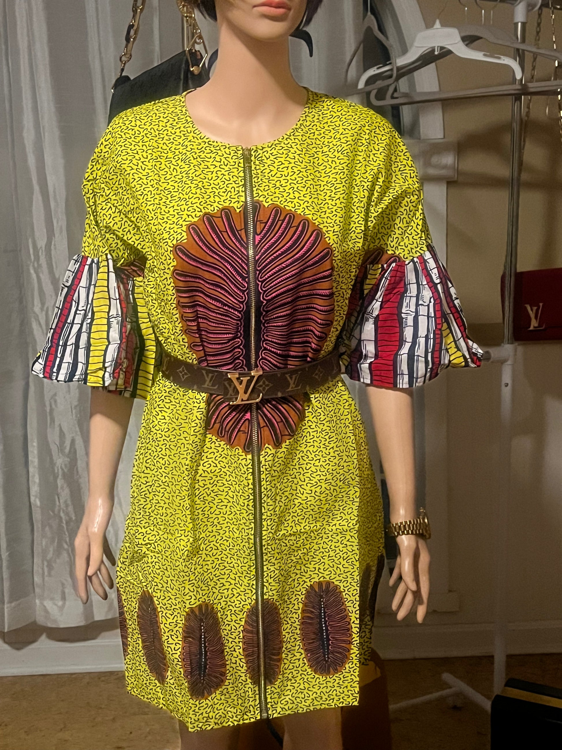 Bright, bold, and stylish—this yellow Ankara mini dress features artistic brown motifs and striking contrast sleeves. With a front zipper and flattering fit, it’s perfect for parties, cultural events, or everyday chic. African-inspired, modern, and effortlessly Nanuskastyle. 💛
